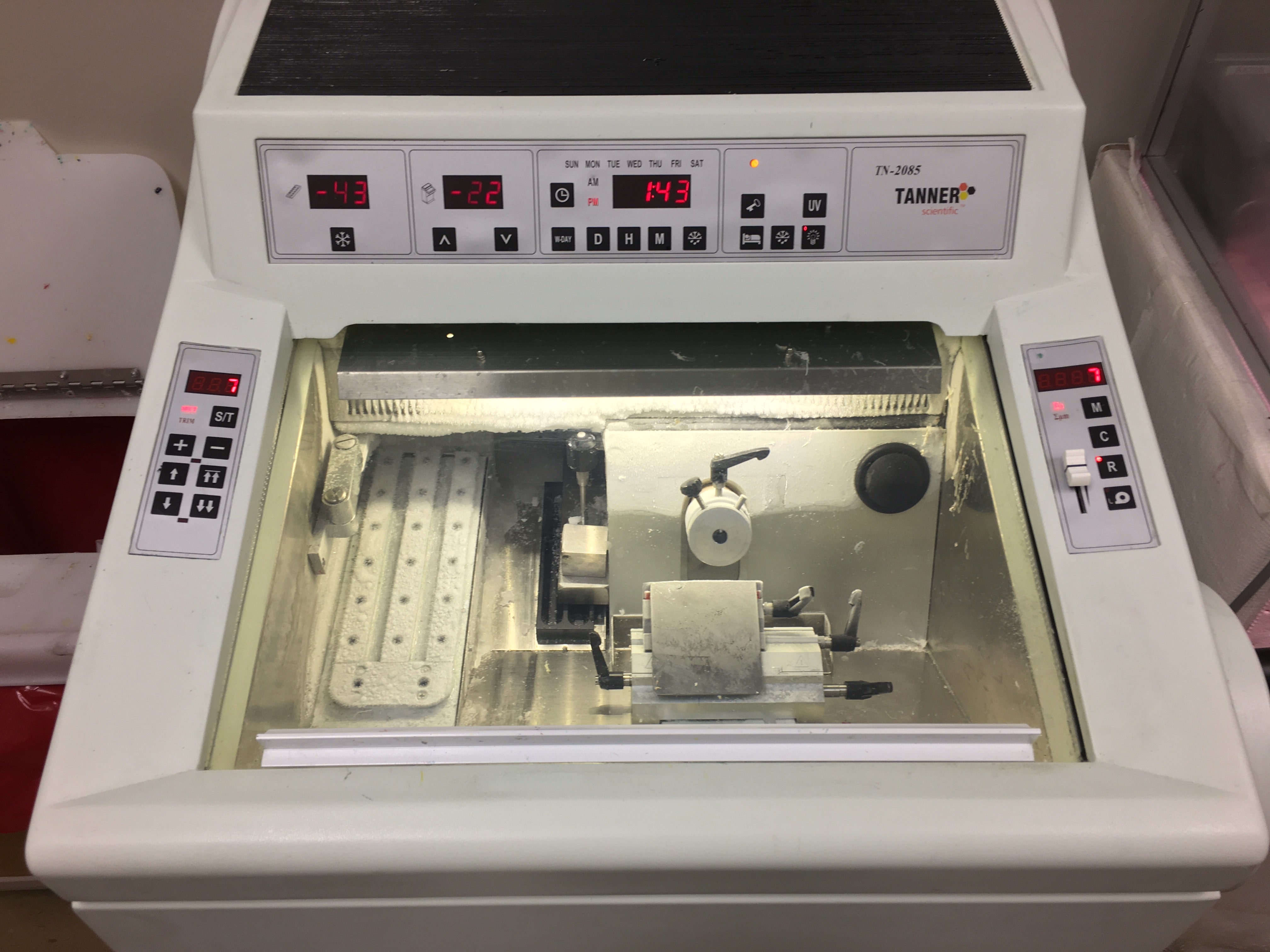 A Cryostat is used to cut very thin sections of frozen tissue, typically at temperatures below freezing. In dermatology, this allows the dermatologist or pathologist to examine the tissue samples at a microscopic level to identify skin diseases, such as skin cancer, melanoma, and other dermatological conditions.